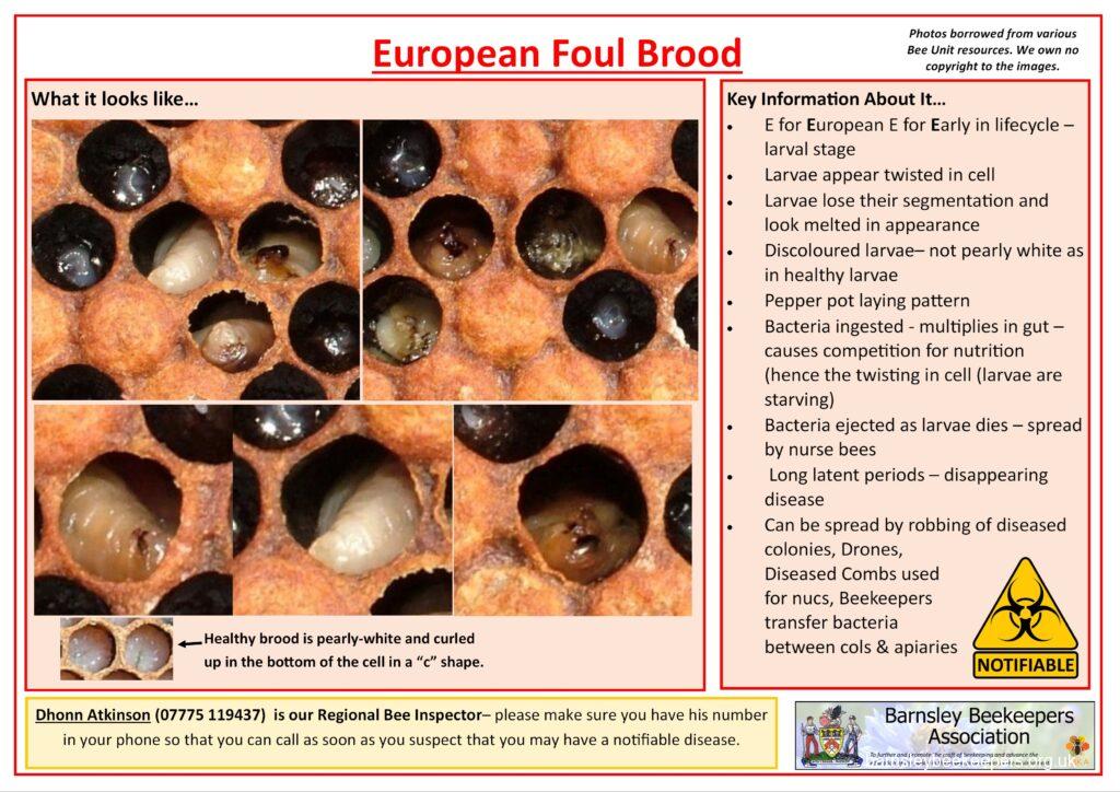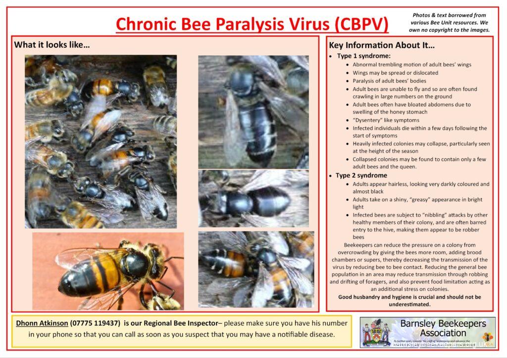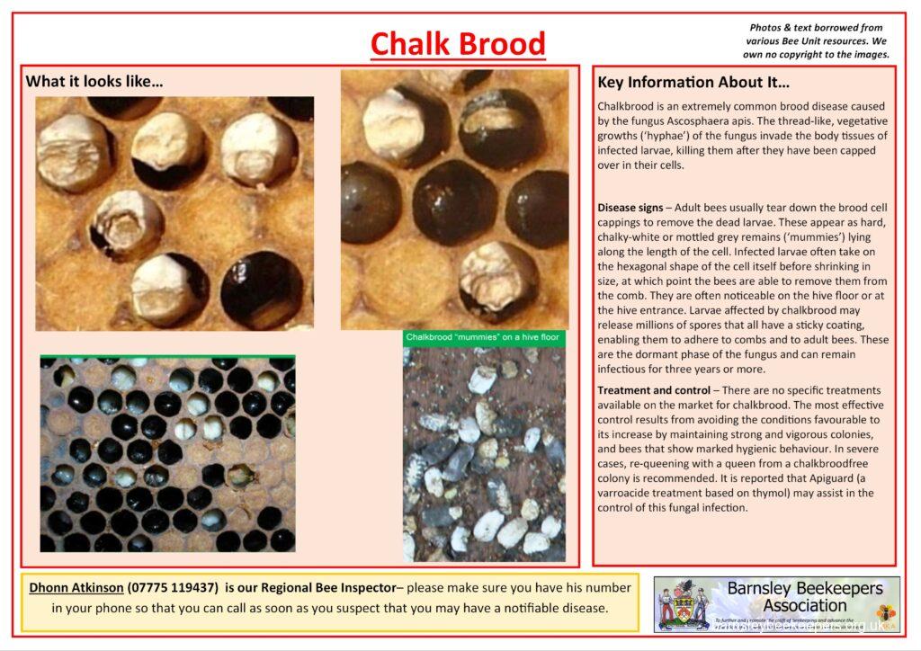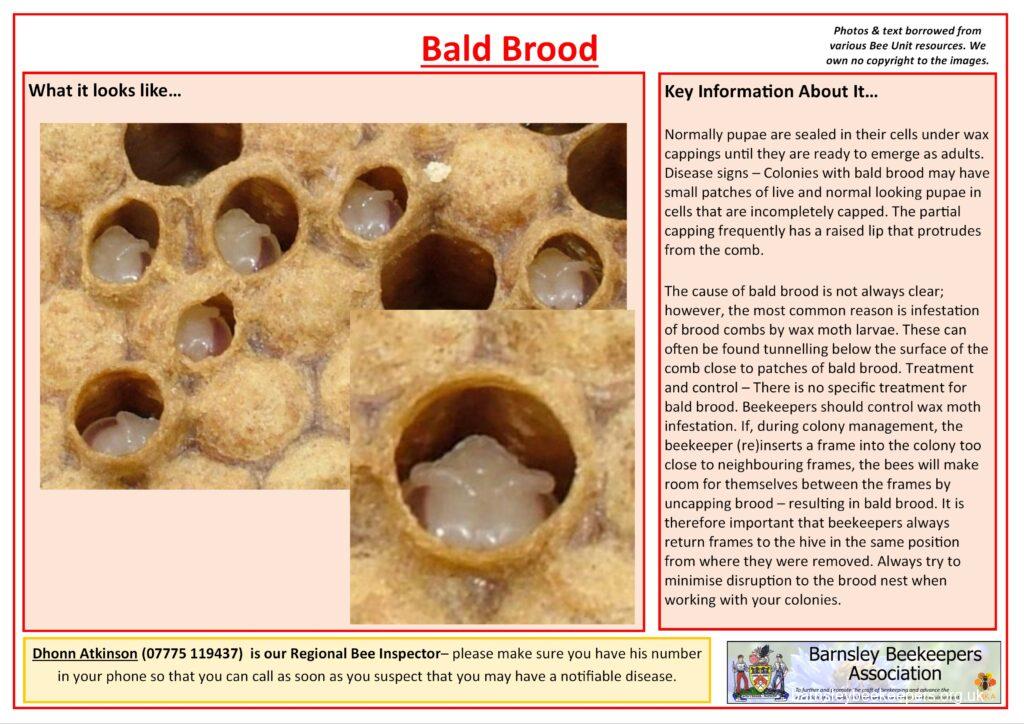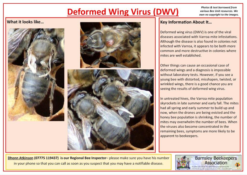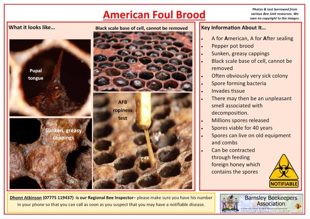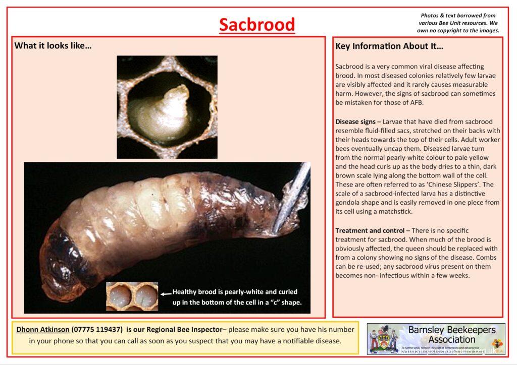 Below are a selection of handy disease recognition cards (click to see larger versions) which you should familiarise yourself with. None of the content belongs to Barnsley BKA; we have borrowed the text and photos from Bee Base and put them into an easy to use (well we think so) format.